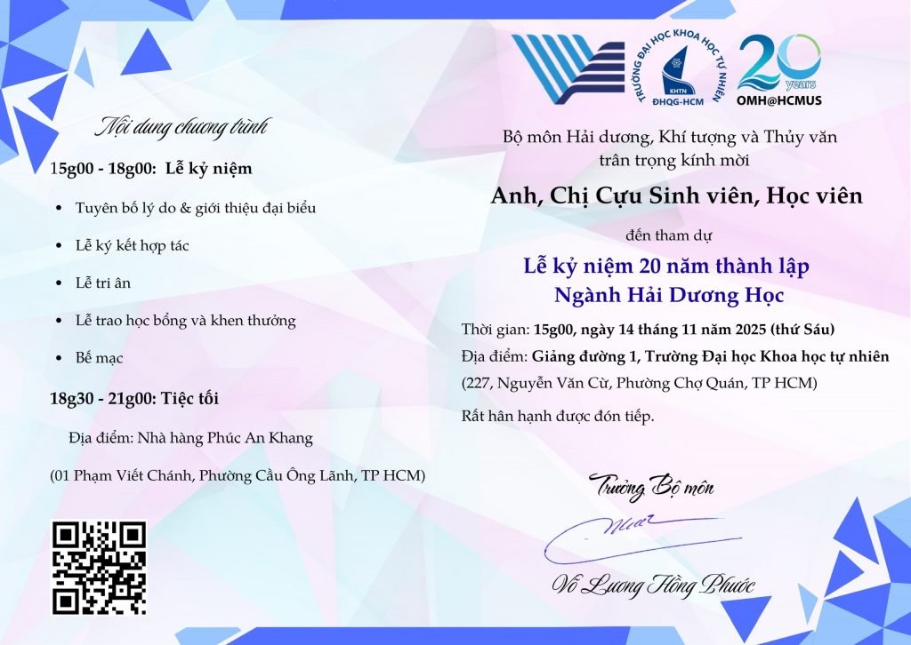 We are honor to host a Workshop on Marine Science and Sustainable Development held on November 14–15, 2025, dedicated to advancing our collective efforts toward ocean research and sustainable development. Especially,  this event marks the journey of 20-year development of the Oceanology education program in the Department of Oceanology, Meteorology and Hydrology, Faculty of Physics-Engineering physics, University of Science, Vietnam National University Ho Chi Minh City (VNUHCM-US). Join us in commemorating two decades of inspiring educational and scientific exploration.