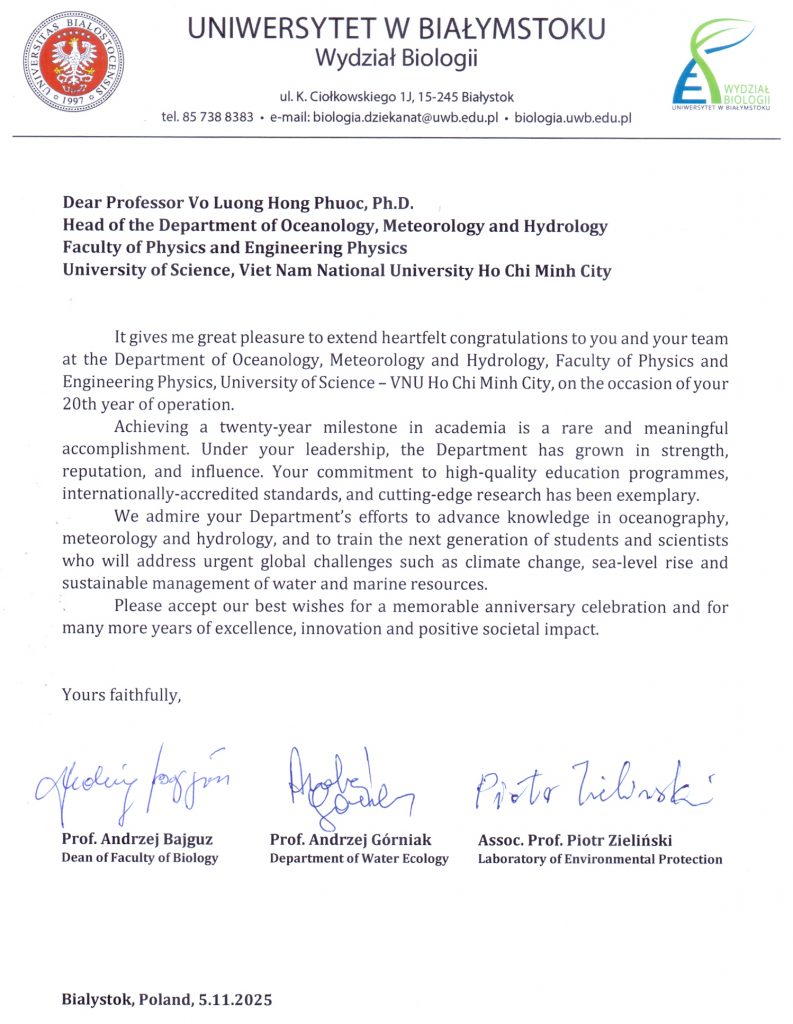 Trong thư, các Giáo sư Andrzej Bajguz (Trưởng Khoa Sinh học), Andrzej Górniak (Khoa Sinh thái) và Piotr Zieliński (Phòng thí nghiệm Bảo vệ Môi trường) đã gửi lời chúc mừng nồng nhiệt đến Bộ môn. Các Giáo sư đánh giá cao nỗ lực bền bỉ của Bộ môn trong việc nâng cao chất lượng đào tạo, phát triển nghiên cứu hải dương học – khí tượng – thủy văn, đồng thời ghi nhận những đóng góp của Bộ môn trong việc đào tạo thế hệ nhà khoa học trẻ có khả năng giải quyết các thách thức toàn cầu như biến đổi khí hậu, nước biển dâng và quản lý bền vững tài nguyên biển.